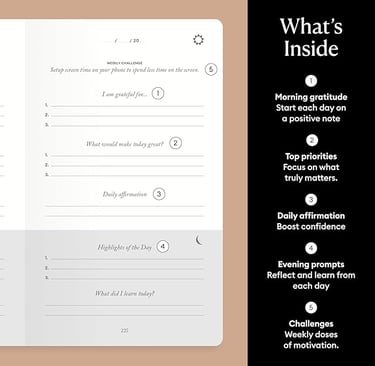 (For example: What am I grateful for today? What is my daily affirmation? What did I learn today? etc)Simple, guided daily practice: Thoughtful prompts, affirmations, and challenges make journaling easy and consistent.