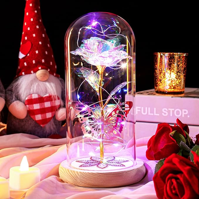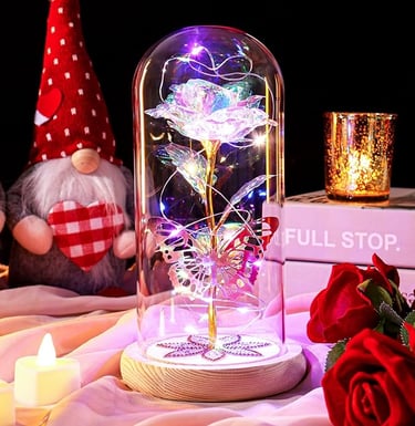A forever colourful rose with 24k gold, LEDs, and glass dome—cute, glowing, eternal love gift for every special woman ever